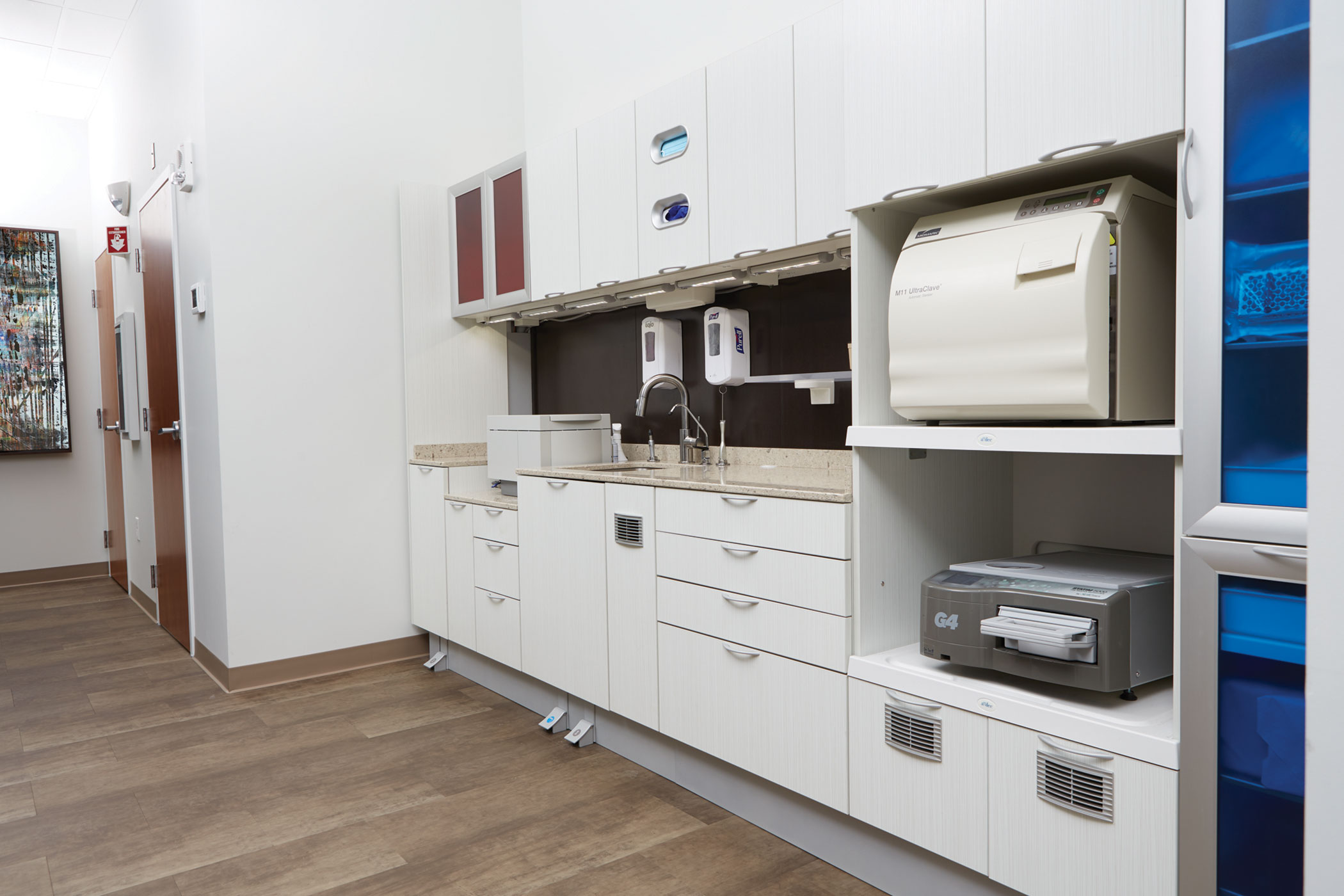 Hallway Sterilization Center Along the hallway, the practice boasts an open, streamlined sterilization center with a Midmark M11 and SciCan Statim G4 autoclave, the latter of which is connected to the internet. Mr. Lasser recommended the A-dec Inspire Sterilization Center for the practice because it has a built-in dryer, which eliminates having tools spread out on the countertops to dry before being loaded into the autoclave.