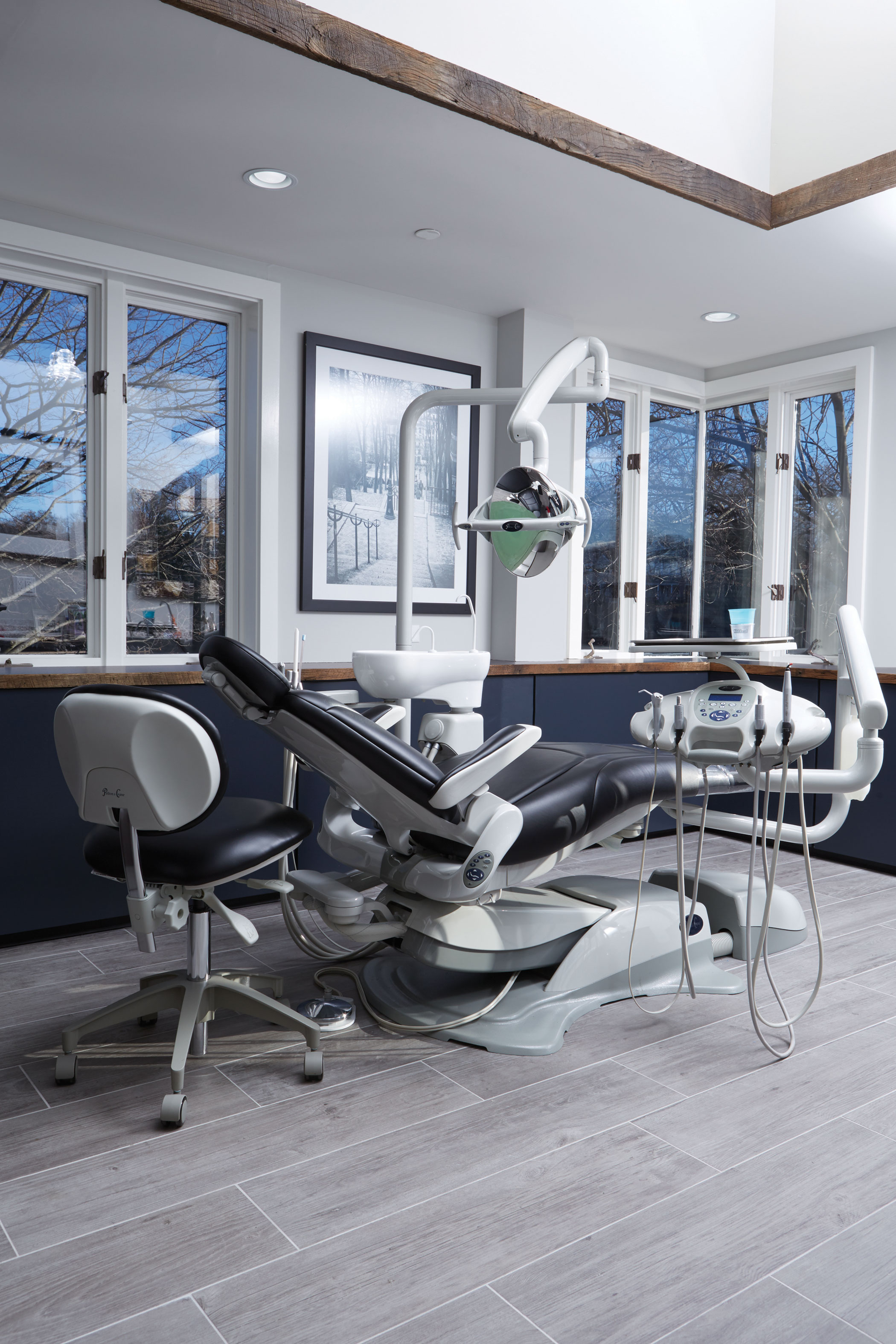Rustic barnwood accents coexist perfectly with the sophisticated luxury of Pelton & Crane Spirit 3000 chairs in all eight operatories. Each operatory is configured identically, ensuring maximum productivity from every room.