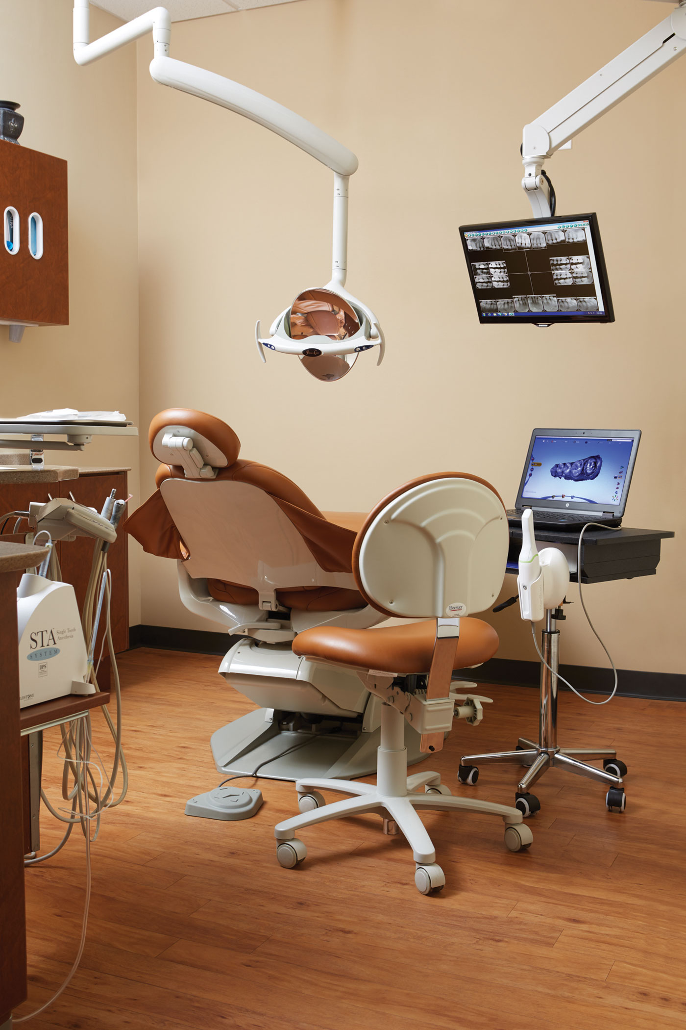 The closed bay operatories feature plush massage chairs, LED lights, and cabinetry from Pelton & Crane. The PlanScan digital impression technology is faster and more comfortable than traditional impressions.
